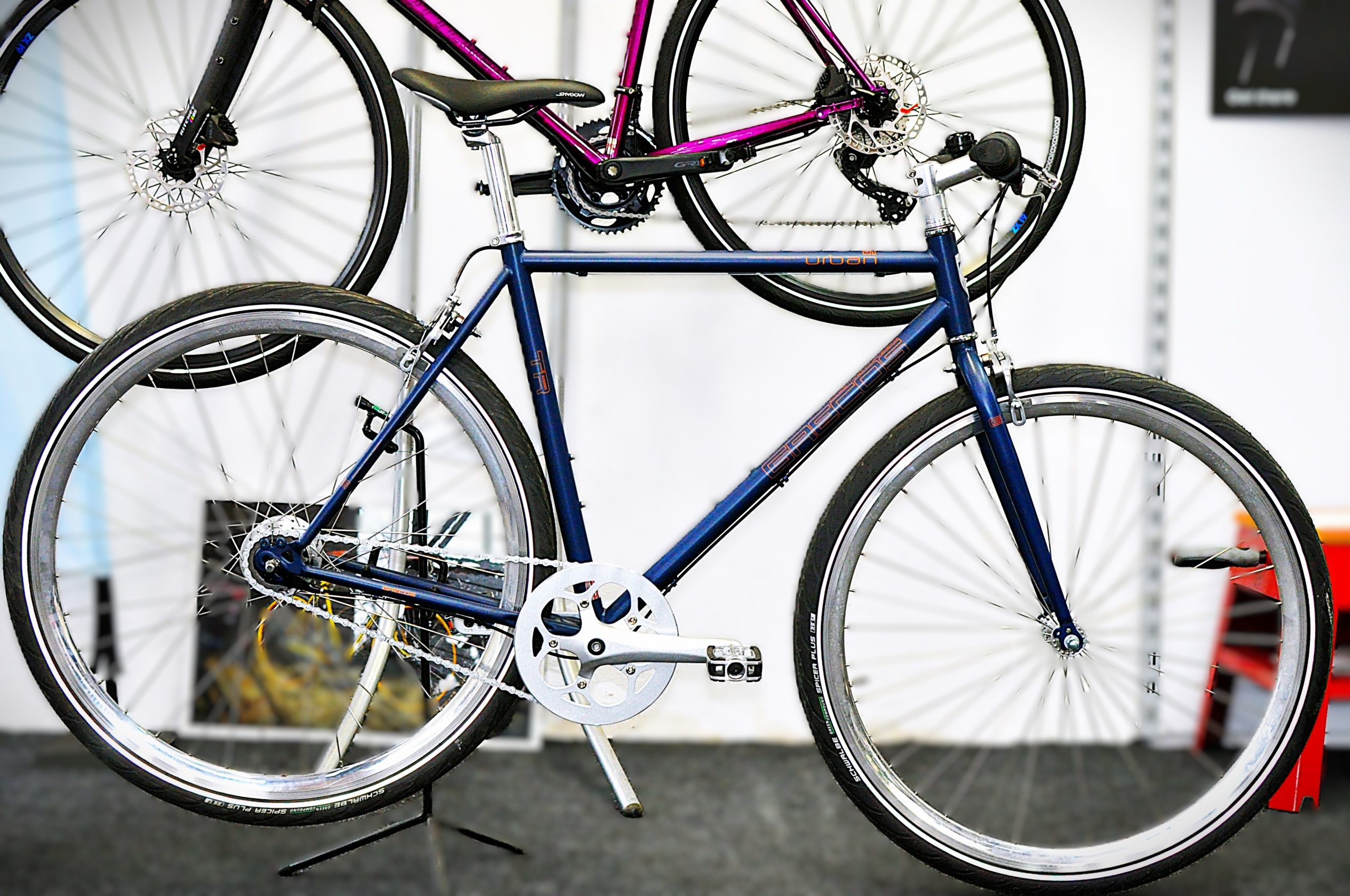 GRECOS ⁄ Das ‚Urban Retro‘ sieht aus wie ein Singlespeed, nur mit ein paar Gängen mehr. Wegen seines sportlich-minimalistischen Auftritts ist das „Urban Retro“ kompromisslos, was die Alltagsausstattung angeht: Gepäckträger oder Schutzbleche mit Strebenbefestigung sind hier nicht vorgesehen. Im Vordergrund steht eher die Fahrdynamik.